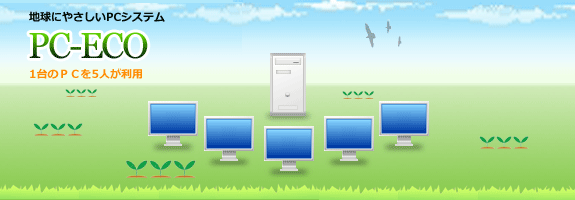 PC-ECOソリューションでは、1台のコンピューター本体にディスプレイ、キーボード、マウス、オーディオなどの入出力装置を追加することにより数名の利用者が同時にコンピューターを利用できるソリューションになっております。